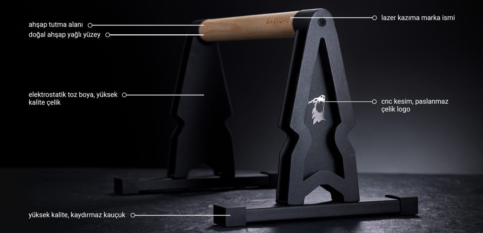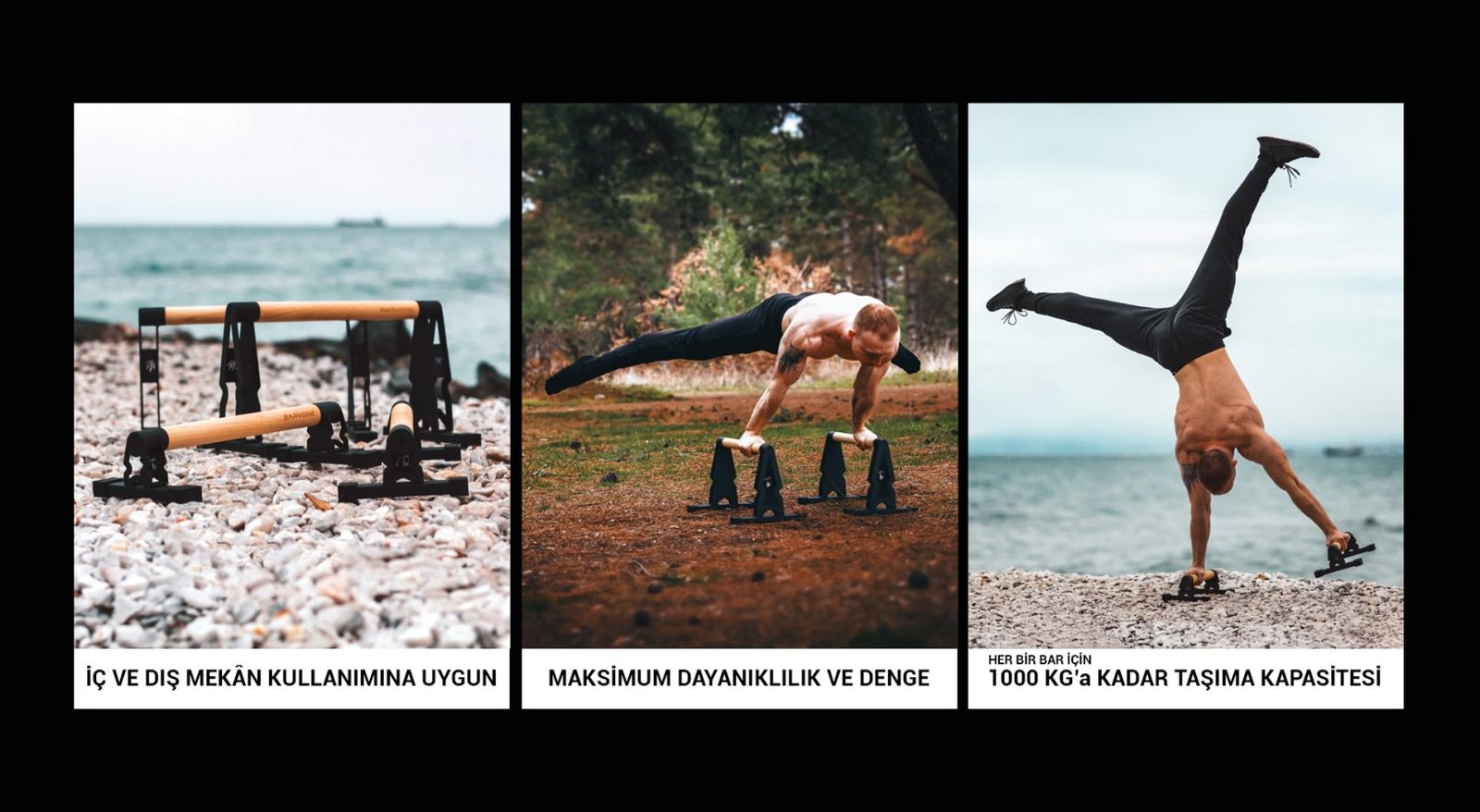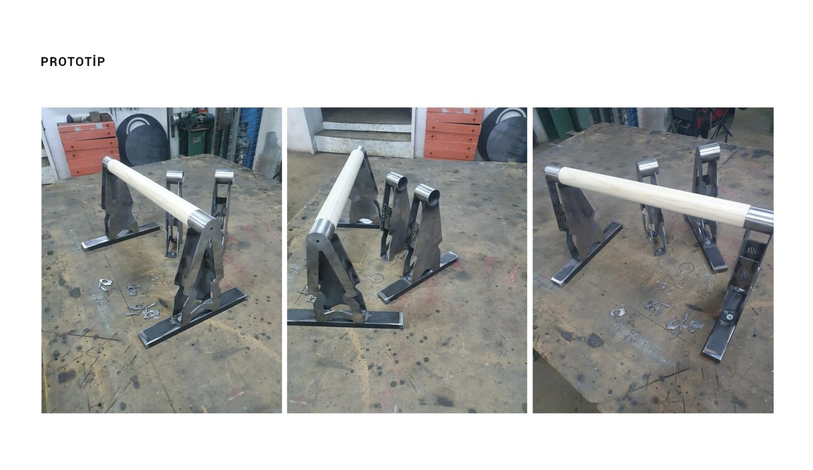 Proje: Calisthenics, minimum ekipmanla ve vücut ağırlığıyla yapılan bir spordur. Calisthenics ve Street Workout egzersizlerine özel olarak tasarlanmış paralel barlar, ayı vücudundan esinlenilerek tasarlandı. Tasarımda, ayının gücünden de yola çıkılarak, ürünlerde dayanıklılık ve güce vurgu yapıldı. Ürünler, ilk prototip üretim sürecine kadar adım adım geliştirildi. Sporcuların, birçok hareketi kolayca ve güvenli olarak yapmasına olanak sağlayan paralel barlar, küçük ve büyük boy ölçülerde 2 set olarak tasarlandı.