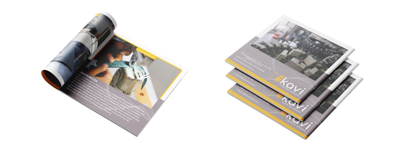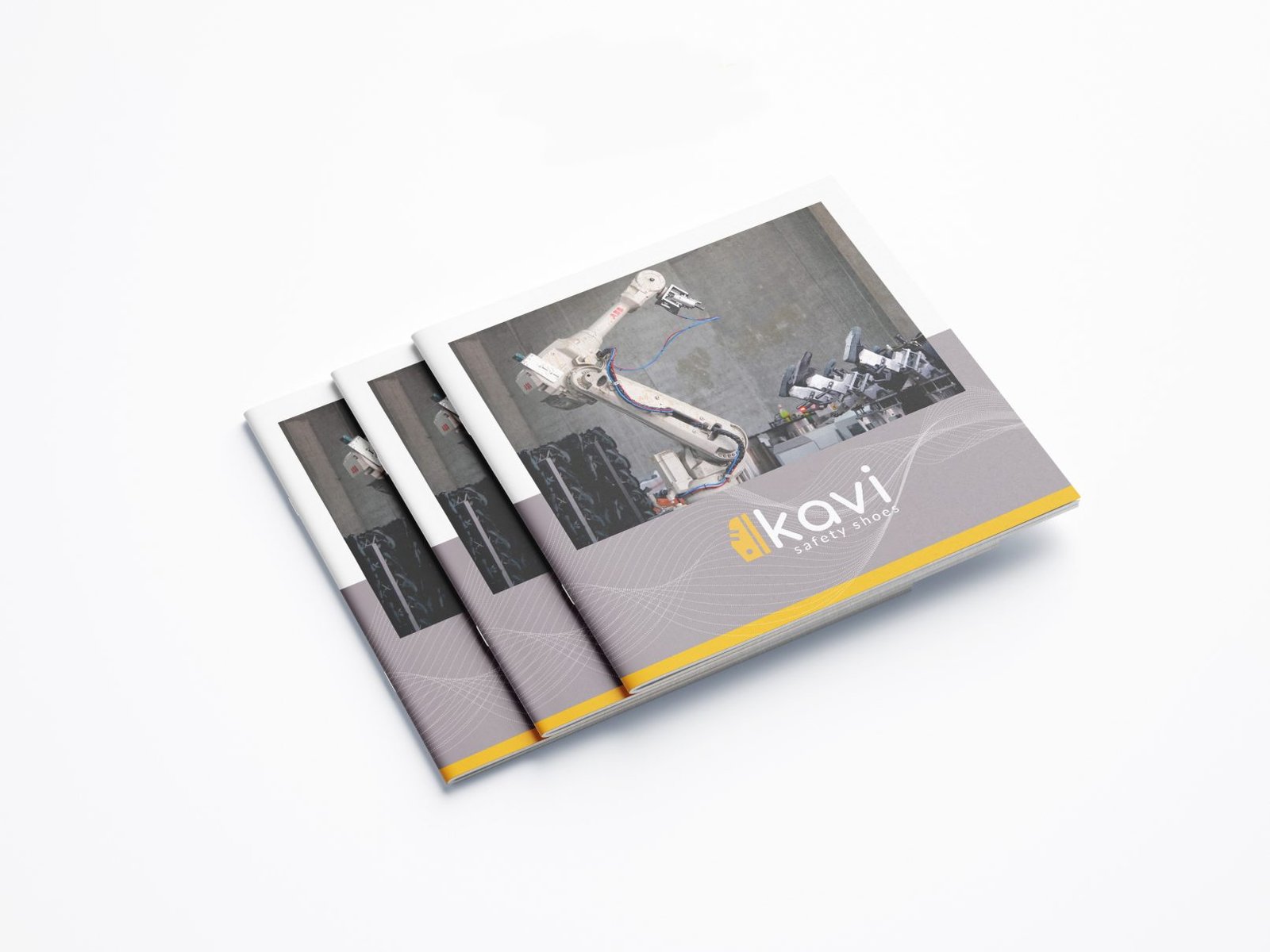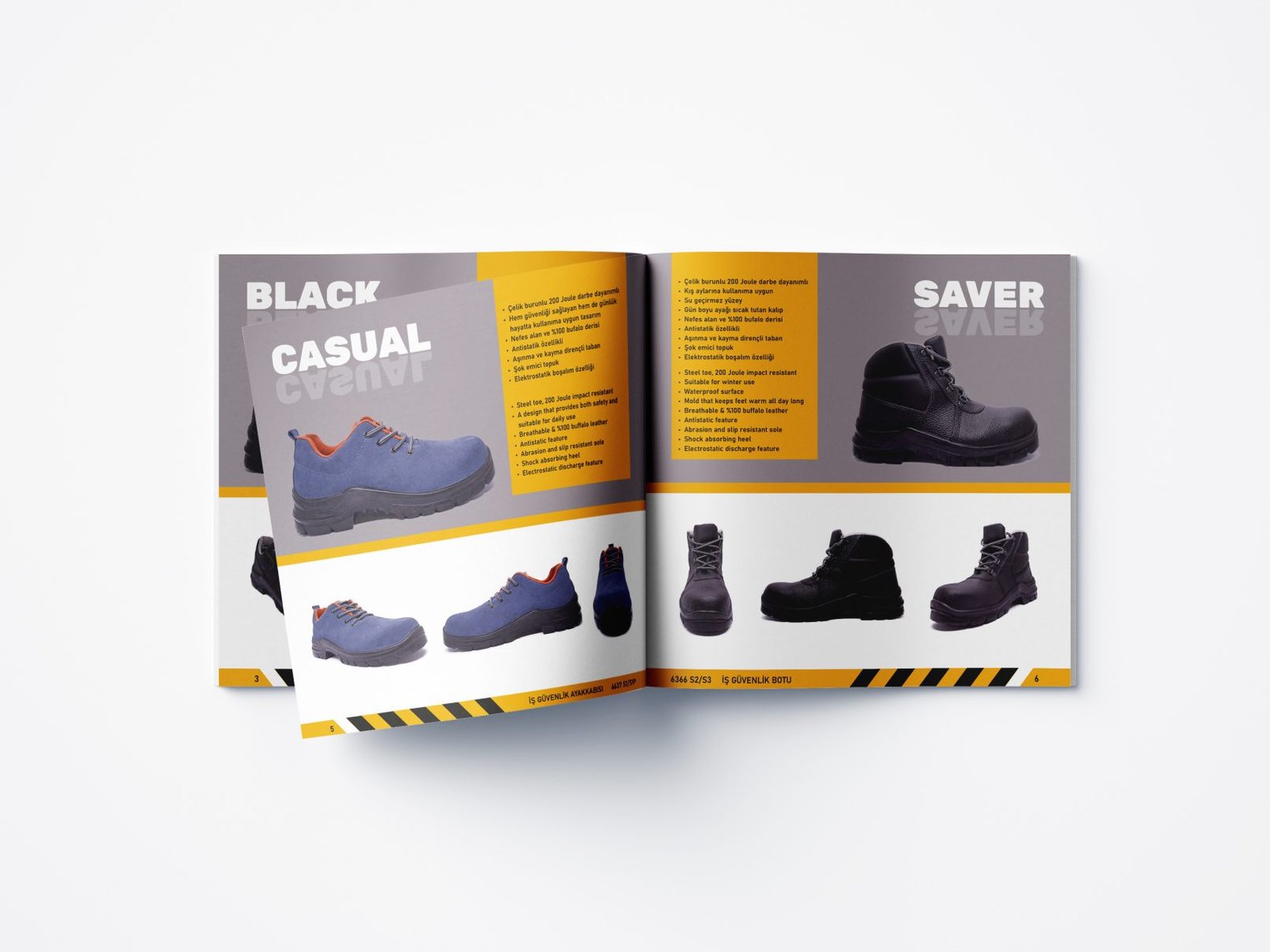 Proje: İş Güvenlik Ayakkabıları üretimi yapan, Kavi Safety Shoes firmasının ayakkabı fuarı için hazırlamış olduğumuz katalog tasarımı. Bu katalog tasarımında, iş güvenliği sektörüne dikkat çekmek amacıyla, sayfalarda sarı-siyah şeritler kullanılmıştır. Ürün açıklamaları ve ürün görselleri ön plana çıkarılmıştır.
